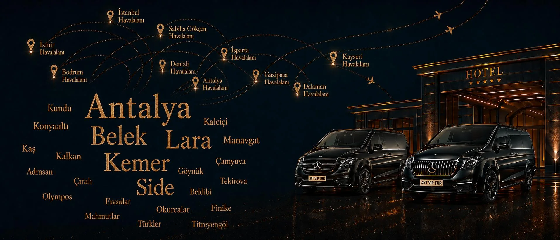 Antalya Havalimanı VIP transfer hizmeti ile havaalanından otelinize veya belirlediğiniz adrese özel şoförlü araçla doğrudan ulaşım sağlıyoruz. Sabit fiyat garantisi, zamanında karşılama ve lüks araç seçenekleri ile Antalya havalimanı transfer sürecini konforlu ve güvenli hale getiriyoruz. Lara, Kundu, Belek, Side,...